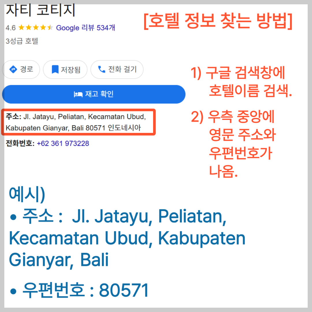 - 숙소 영문명 주소와 우편번호 찾는 방법과 예시입니다.