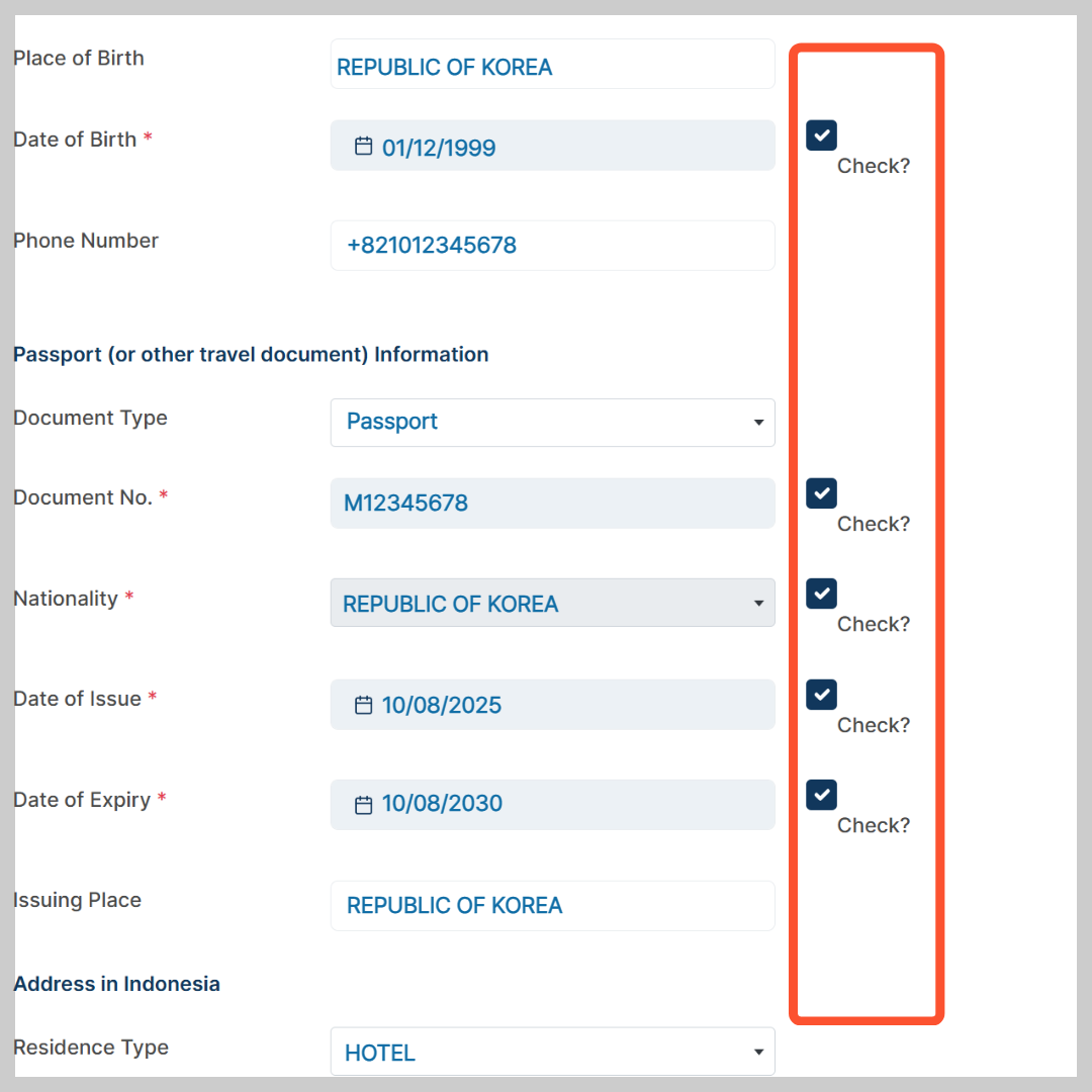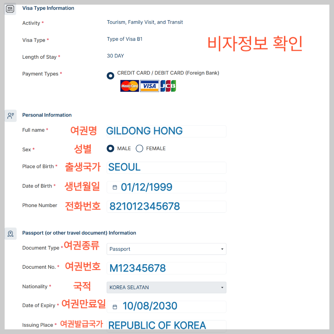 - 이름(여권과 동일 철자·순서), 성별, 출생국가, 생년월일, 전화번호, 여권종류, 여권번호, 국적, 여권만료일, 여권발급국가