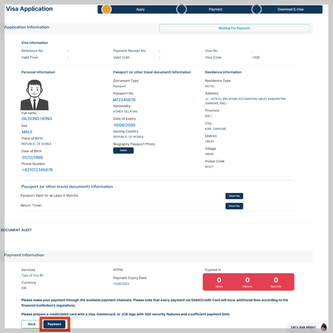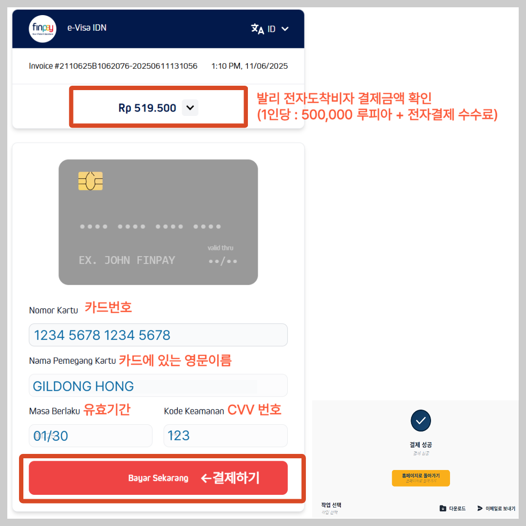 - 전자도착비자 결제 금액은 기본 비자 요금 Rp 500.000 + 전자결제 수수료 Rp19.500 = Rp 519.000(1인당) 입니다.