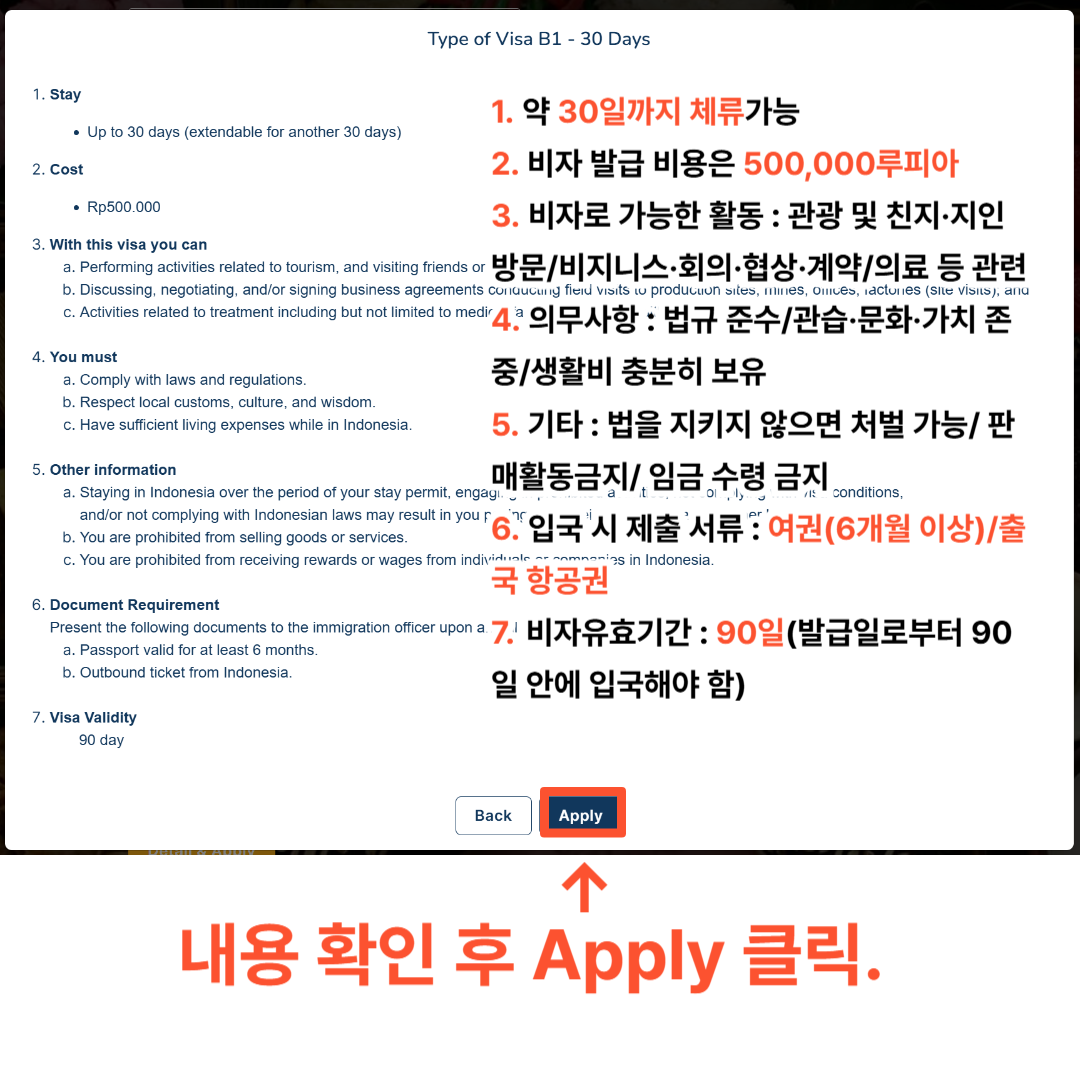 5) 비자 조건 및 법률 어기면 벌금/추방 등 법적 책임을 질 수 있음. 인도네시아에서 영리활동 금지(임금을 받거나 판매활동 금지)