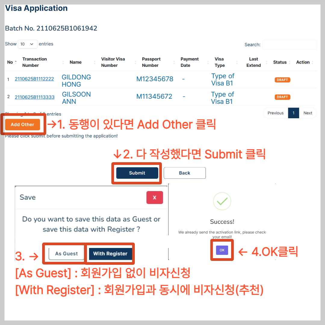 - [WITH Register]: 회원등록을 하고 비자 신청 진행. 이 방법을 권장 함(이메일·비밀번호 생성 → 추후 수정/조회 용이)